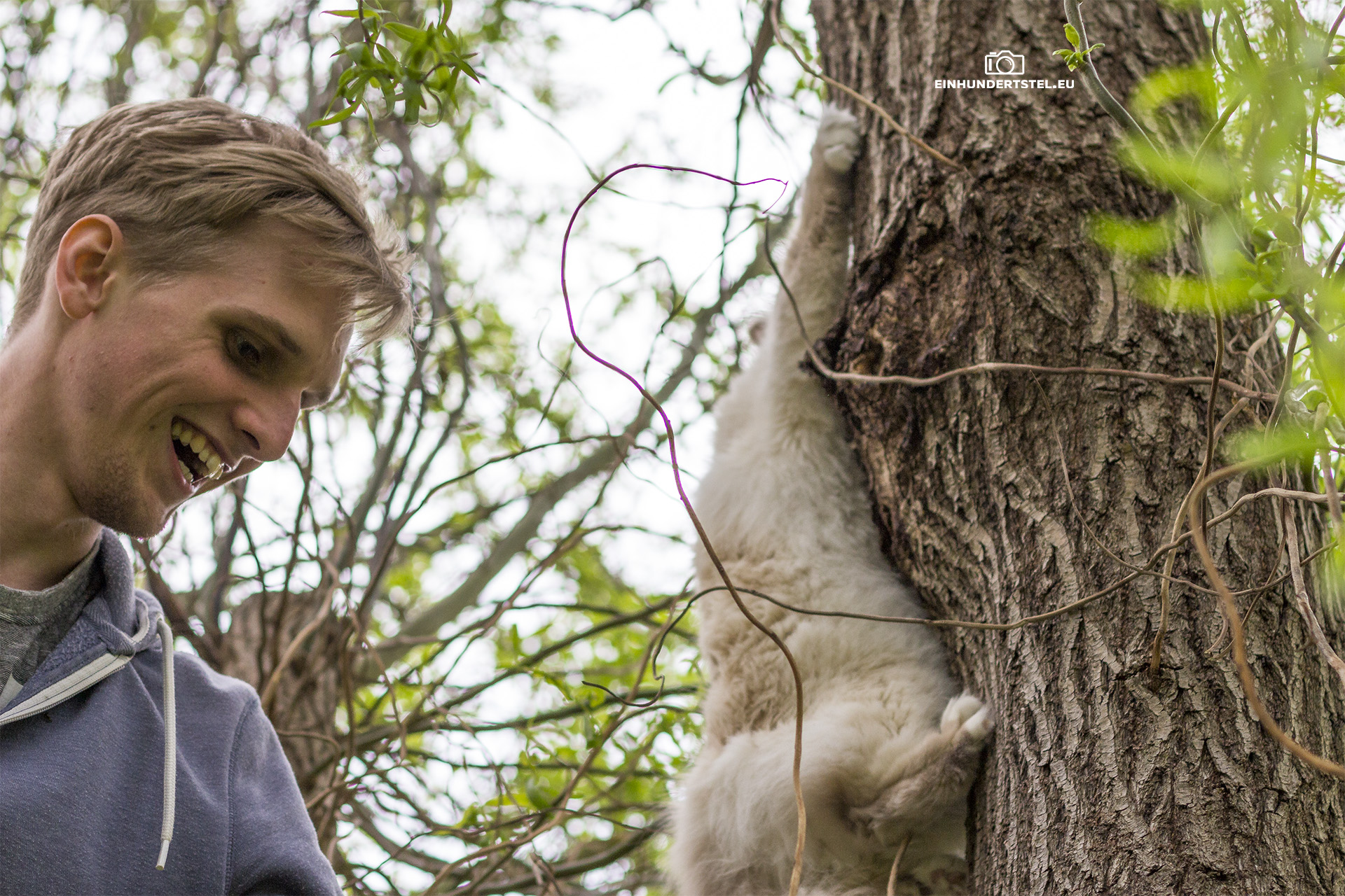 Rico, der auch da war, wurde sofort als Feuerwehrmann zu meiner Rettung auf den Baum geschickt. Mist. Da hatte ich dann wohl doch die A-Karte. Seit wann können denn Menschen auch auf Bäume klettern…? Und dann noch so schnell.