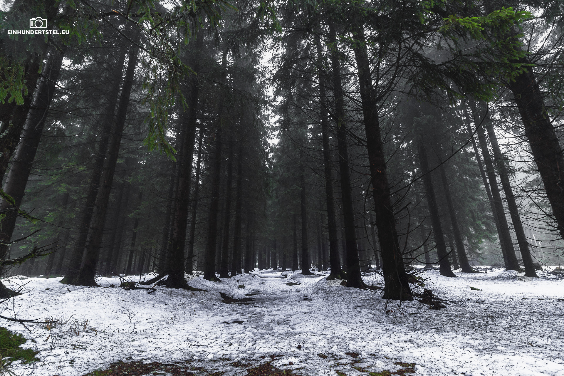Gut gelaunt und frischen Mutes ging das erste kurze Stück auch flott voran. Bis eben zur ersten Biegung. Dieses kurze Stück musste wohl auch den Namen für eine leichte Tour gegeben haben. Ab dann ging es nämlich nur noch bergauf. Nur noch bergauf. Immer nur bergauf. Hatte ich schon erwähnt, das es nur bergauf ging? Mit einer wohl 19 % igen Steigung. Die Sonne hatte den Wanderweg in eine Eisbahn verwandelt. Spikes wären da wohl angebracht gewesen.