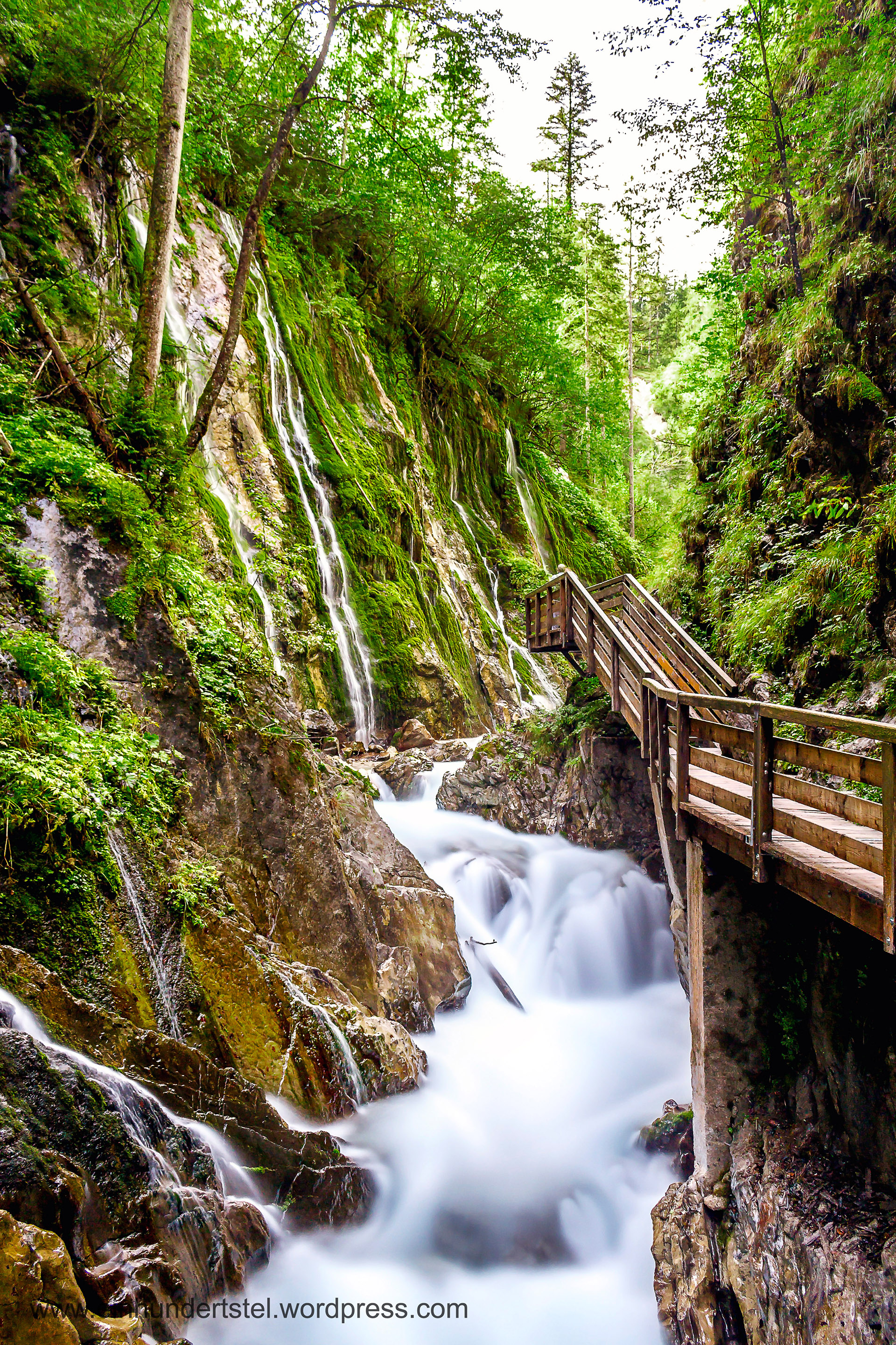 Letzter Tag. Die Wimbachklamm war Rico´s Wunsch. Außerdem war da kein großer Auf-oder Abstieg nötig. Was mir auch sehr zu Gute kam. Auf einer Länge von 200 m kann man auf engen Stegen zwischen den steilen Felswänden der Schlucht entlang gehen. Langzeitbelichtungen und auch der Pol-u. Graufilter kamen wieder zum Einsatz.