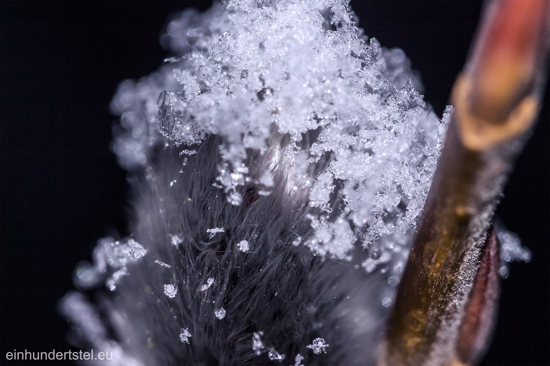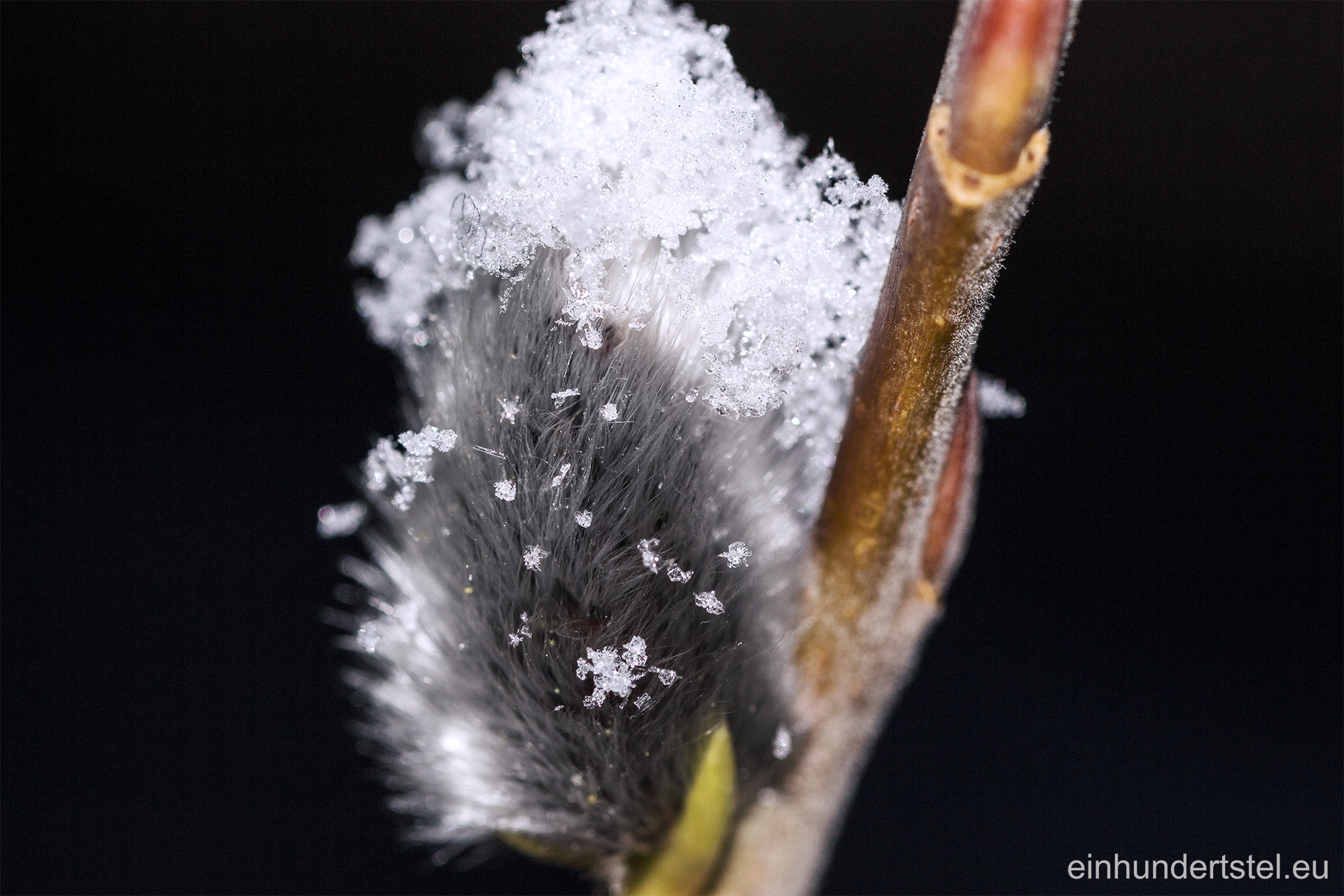 Deshalb habe ich die Weidenkätzchen dann aus lauter Frust mit dem Blitzlicht fotografiert. Ohne Blitz waren sie ständig verwackelt. Stativ hatte ich keins dabei und den ISO hatte ich schon so hoch gestellt, dass im Foto das starke Rauschen überwiegt hat.