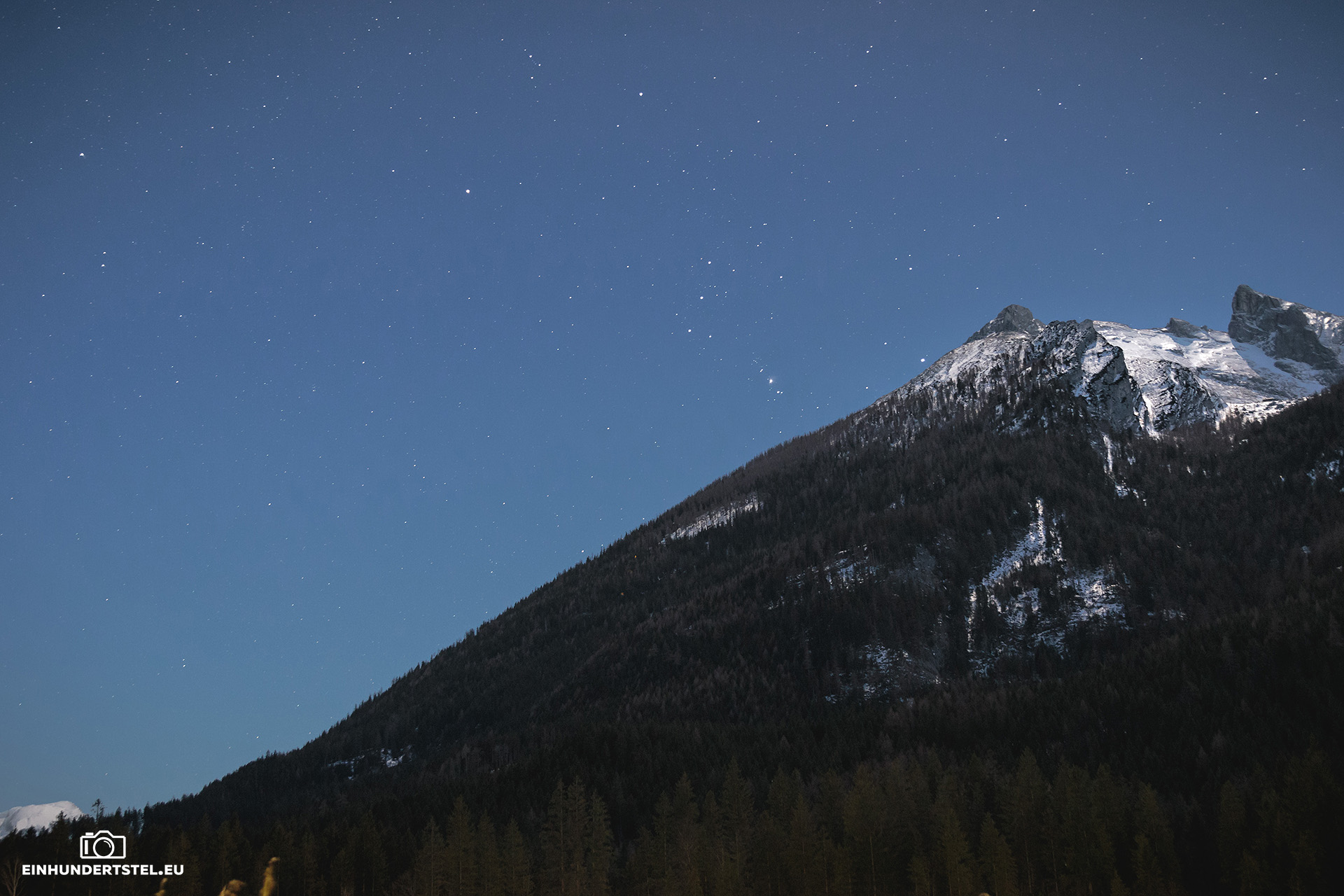 Danach waren wir gestärkt und aufgewärmt und bereit für einen bemerkenswerten Sternenhimmel. Doch es waren wohl noch nicht alle Sterne willens für uns zu leuchten und somit mussten wir uns eben mit den spärlichen Einsatz der Sterne anfreunden, die gerade eben Zeit hatten. Der Mond spendete auch sein Licht, was für ein Sternhimmelfoto auch nicht so passend ist.