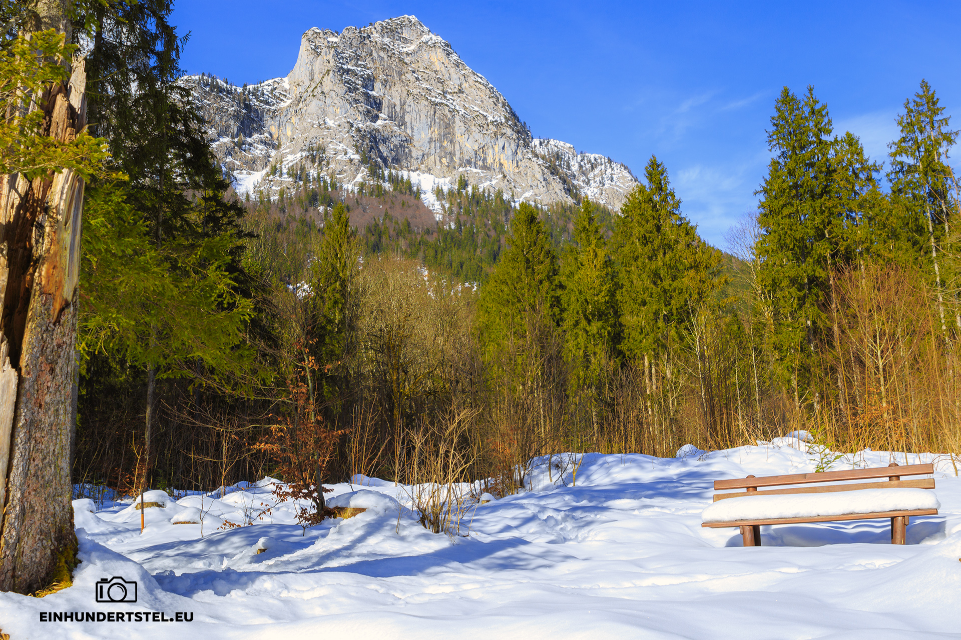 Im Hotelzimmer durften wir ja sowieso erst später einchecken und deshalb sind wir gleich zu unserem Lieblingsspot gefahren. Zum Hintersee in Ramsau. Inzwischen hatten wir auch das Wetter welches wir uns redlich verdient hatten. Nämlich strahlenden Sonnenschein, azurblauen Himmel und die Temperaturen um die Null Grad. Und um den See herum und auf den Bergen Schnee.