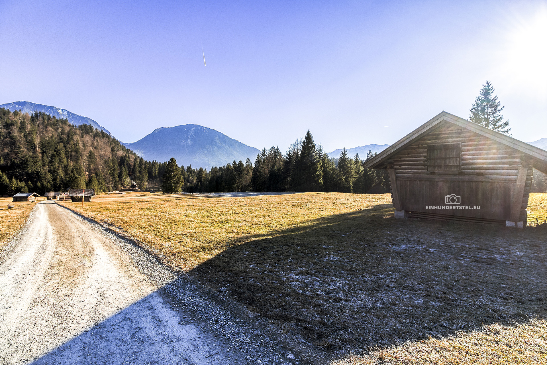 Im Hotel wollten sie uns als ihre Gäste erst ab 15:00 Uhr begrüßen. Deshalb ging es gleich an den Ort unserer ersten Tour.  Los ging es am Pflegersee (liegt etwa 2 km oberhalb von Garmisch-Partenkirchen), der unterhalb des Königsstandes liegt.