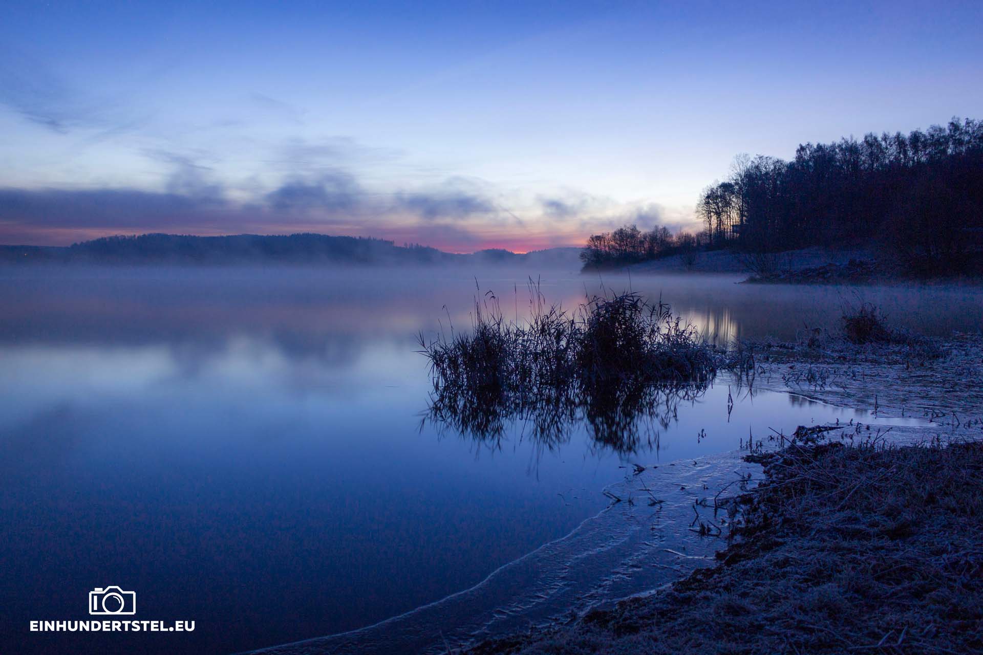Da waren wir also nun an der Talsperre Pöhl. Ohne zu jammern (kaum vorstellbar oder?) bauten wir das Stativ auf und warteten kurz bis es los ging. Der Wetterbericht hatte nicht gelogen. Alles war wie gewünscht. Außer die Kälte… die hätte nicht sein müssen!