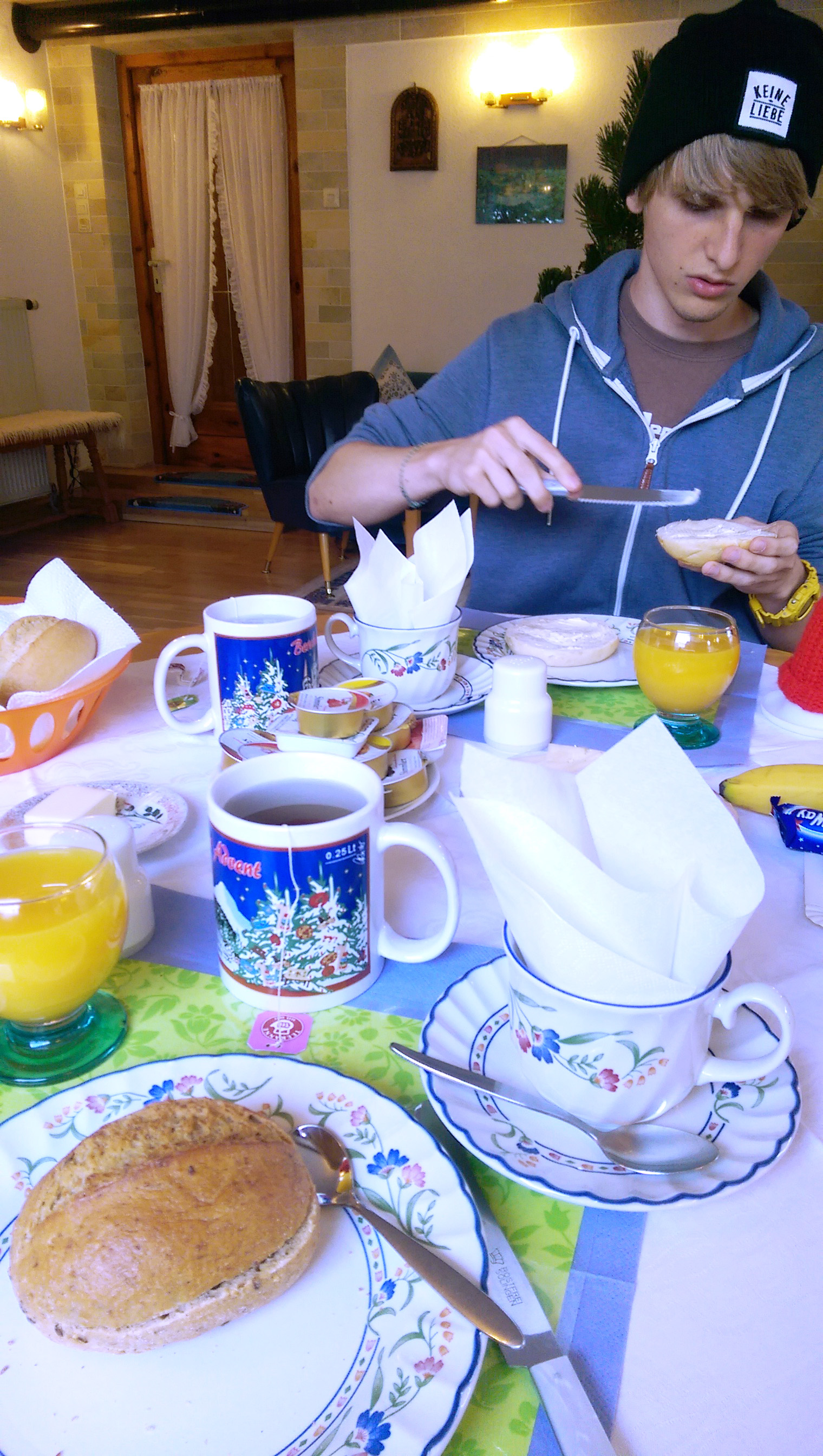 Schließlich saßen wir 09:20 Uhr am Frühstückstisch. Natürlich waren alle anderen schon ausgeflogen und wir hatten das Frühstückszimmer für uns.