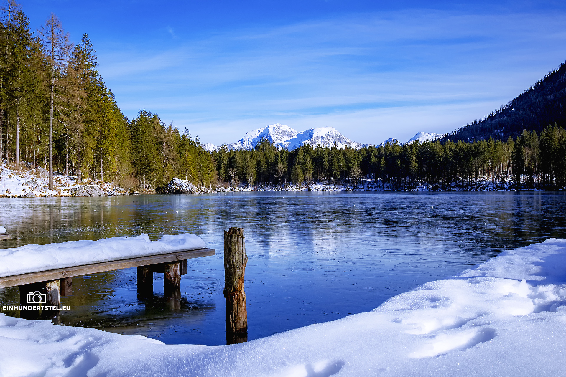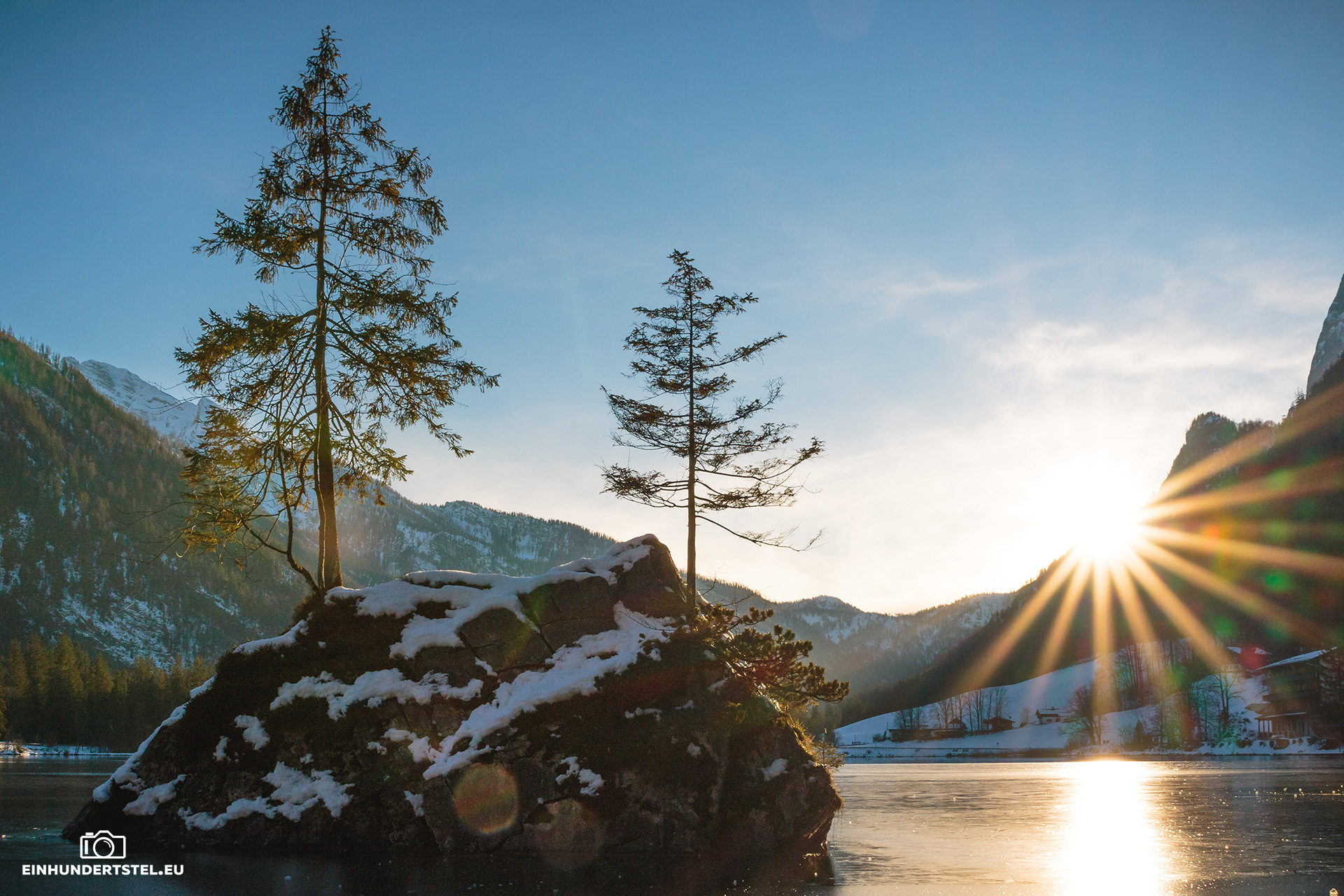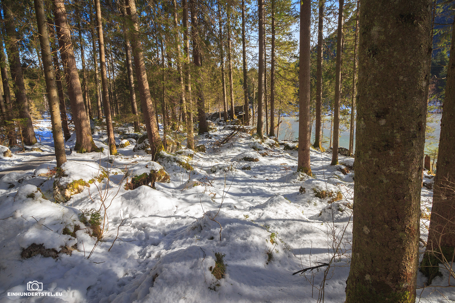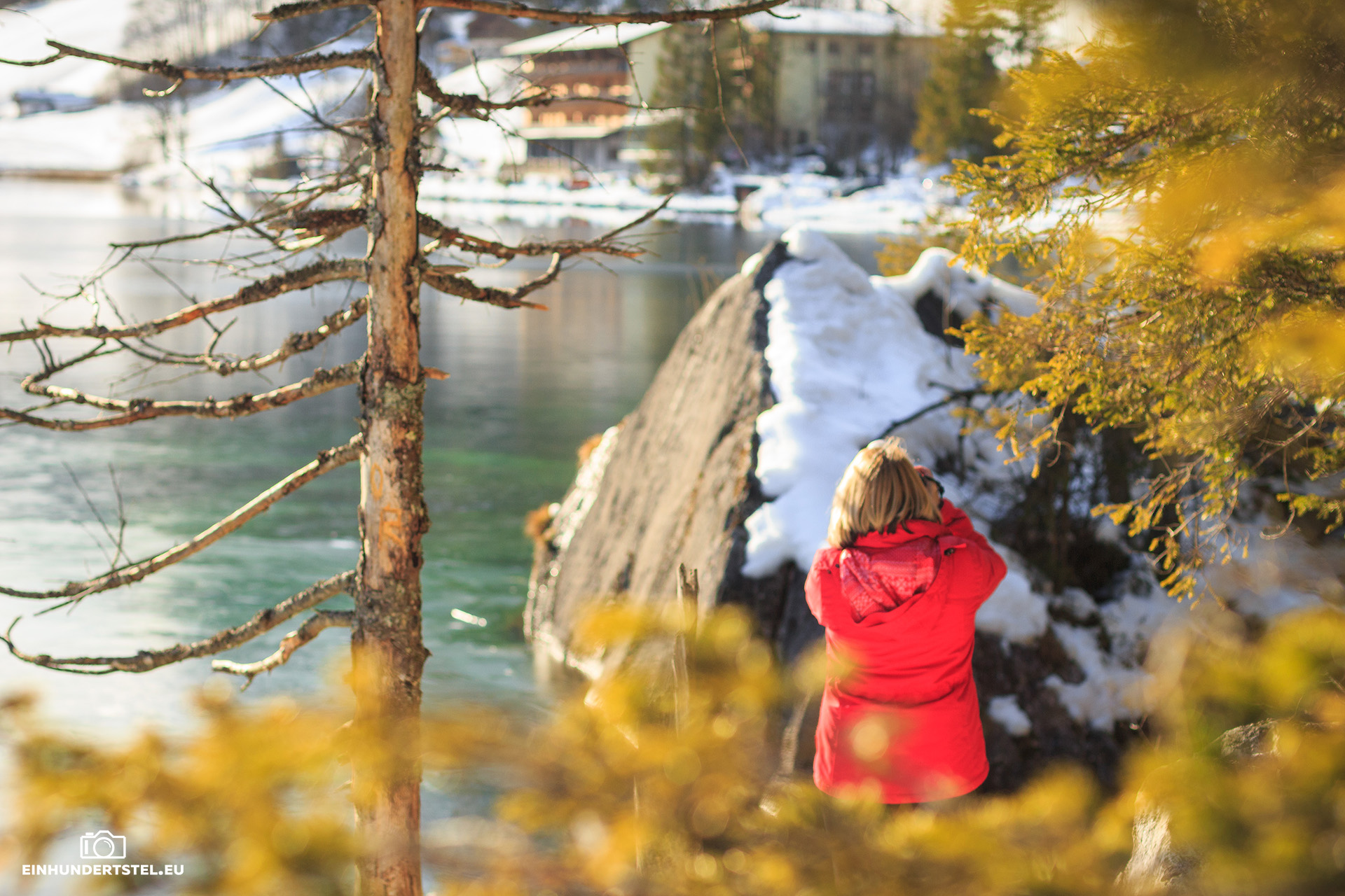 Im Hotelzimmer durften wir ja sowieso erst später einchecken und deshalb sind wir gleich zu unserem Lieblingsspot gefahren. Zum Hintersee in Ramsau. Inzwischen hatten wir auch das Wetter welches wir uns redlich verdient hatten. Nämlich strahlenden Sonnenschein, azurblauen Himmel und die Temperaturen um die Null Grad. Und um den See herum und auf den Bergen Schnee.