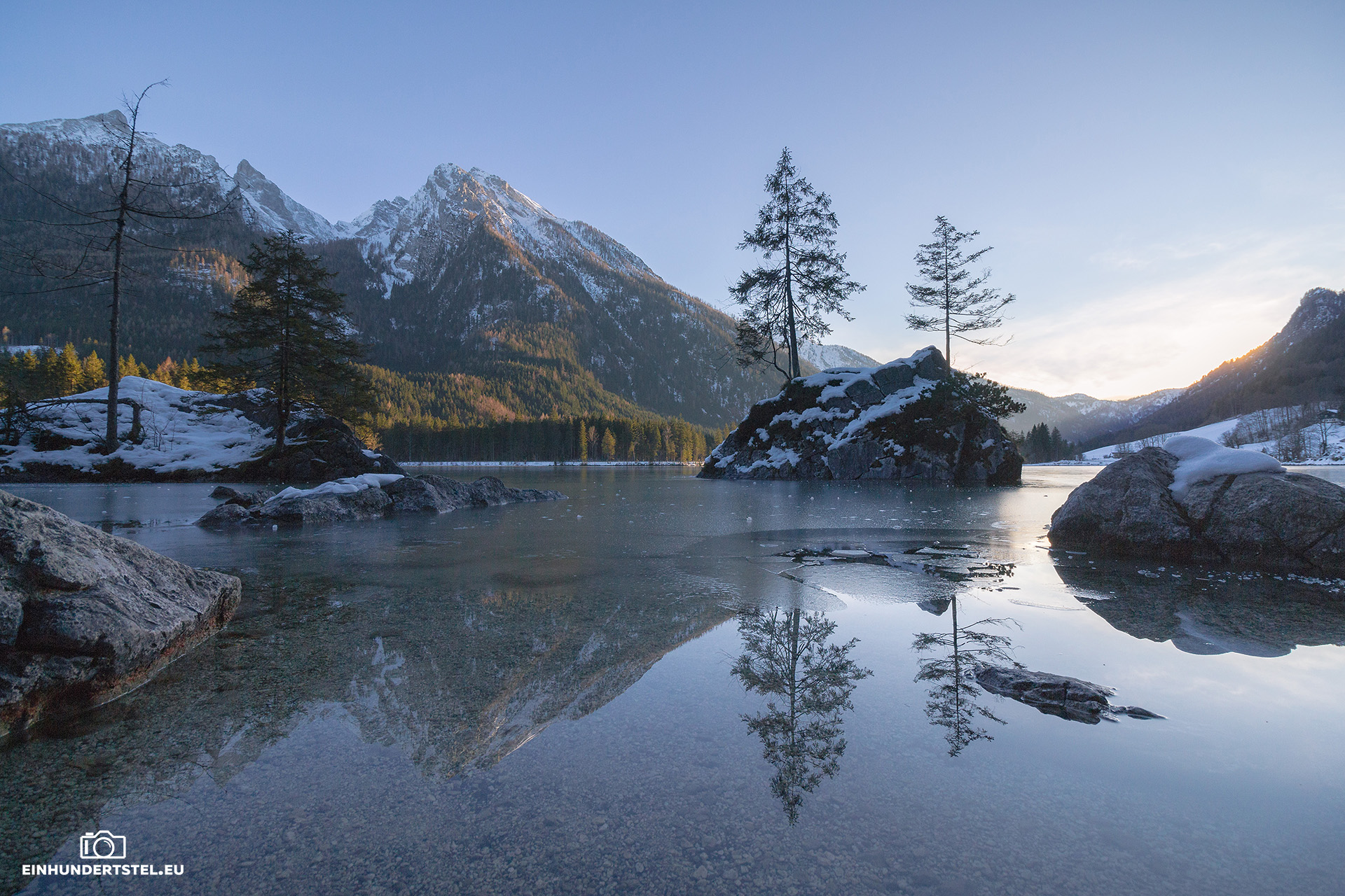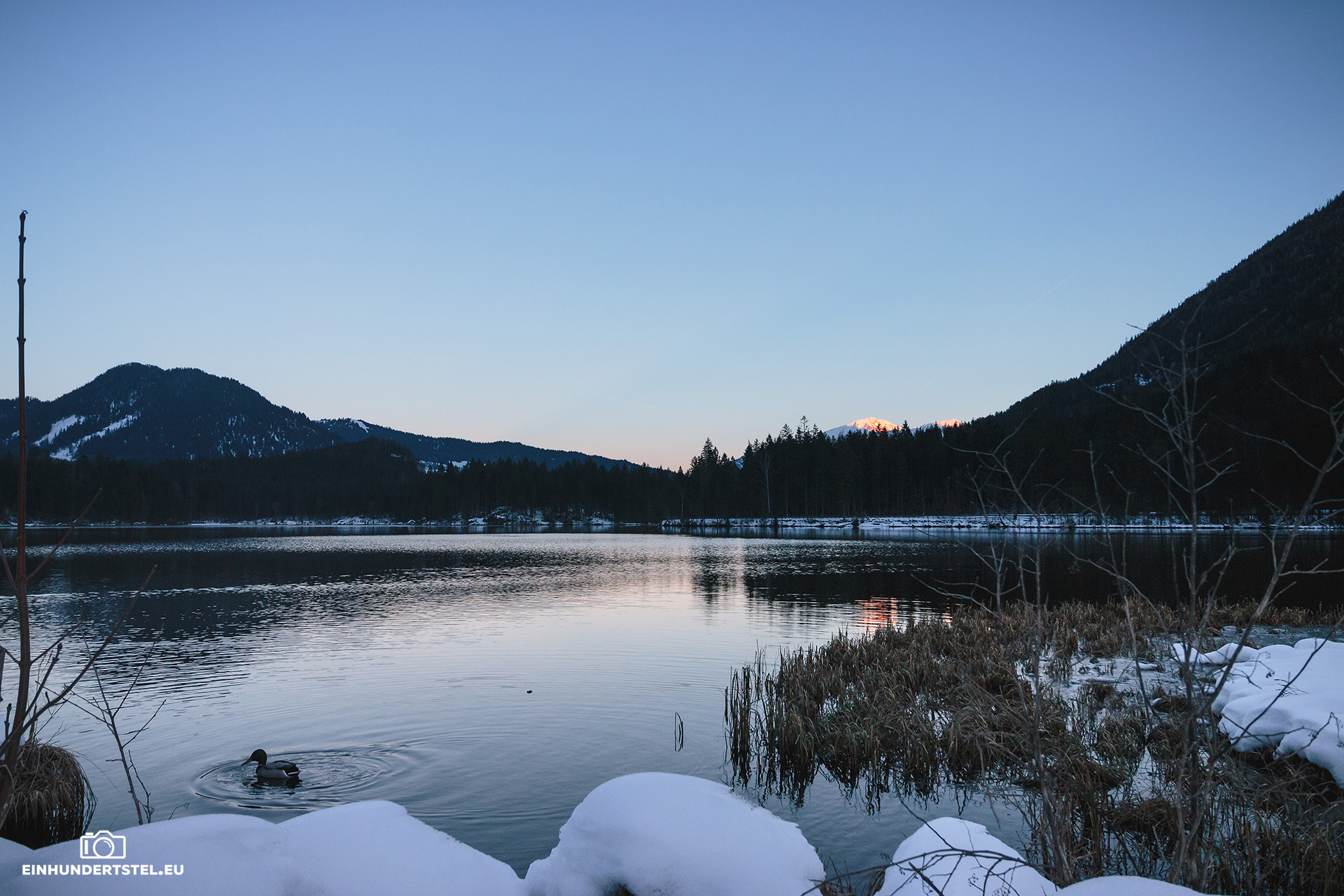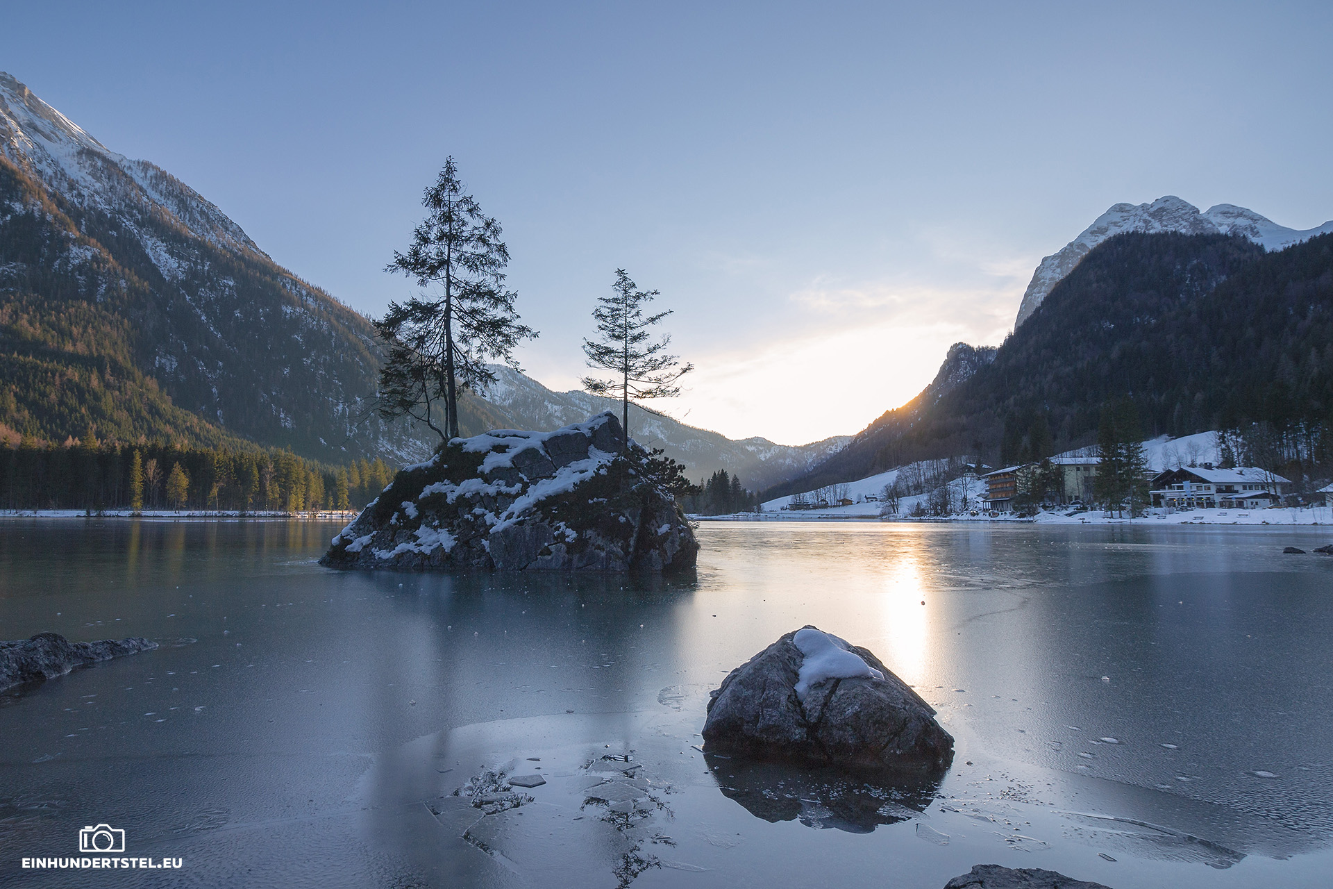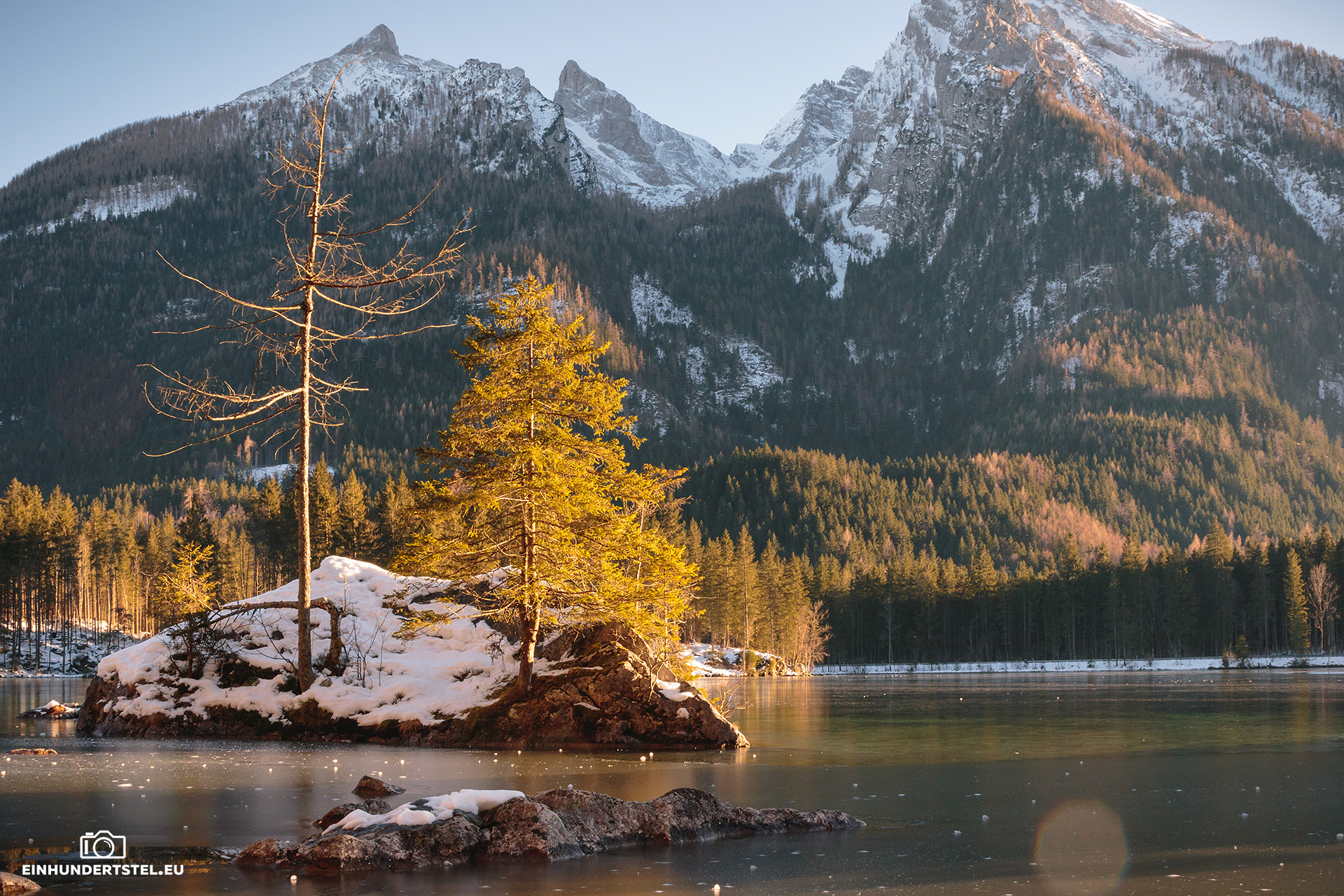 Im Hotelzimmer durften wir ja sowieso erst später einchecken und deshalb sind wir gleich zu unserem Lieblingsspot gefahren. Zum Hintersee in Ramsau. Inzwischen hatten wir auch das Wetter welches wir uns redlich verdient hatten. Nämlich strahlenden Sonnenschein, azurblauen Himmel und die Temperaturen um die Null Grad. Und um den See herum und auf den Bergen Schnee.