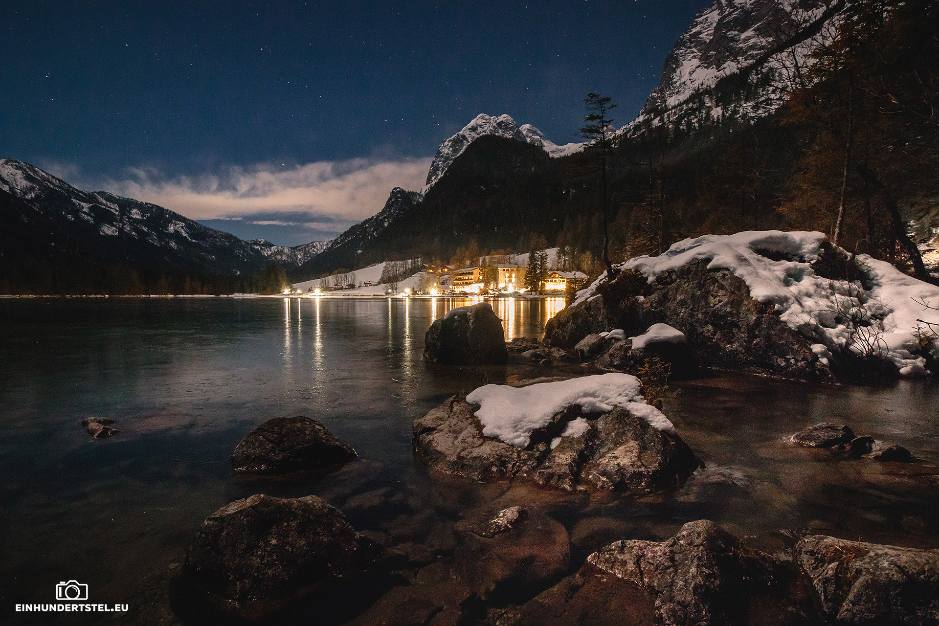 Als die Sonne hinter den Bergen verschwunden war, wurde ein kleiner Spaziergang um den See von Nöten. Schließlich wollten wir noch Zeit schinden und warten bis es einen Sternenhimmel geben würde. So konnten wir eben auch noch die beleuchteten Häuser in der Nähe des See fotografieren, die sich im Wasser gespiegelt haben.