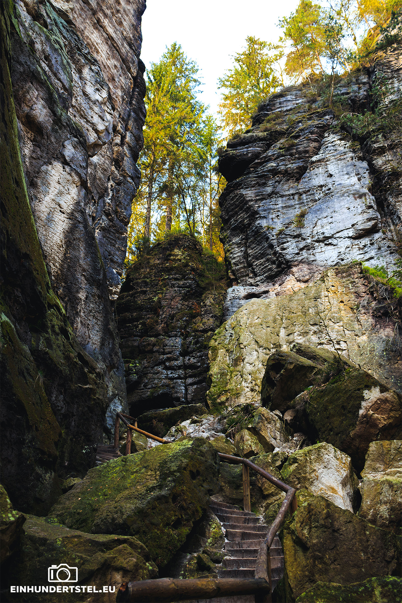 Mit vielen Fotos im Gepäck, wobei die reichlichen Wasserläufe durchaus auf ihre Kosten kamen, ging es durch die Schlucht der Schwedenlöcher (dienten im 30 jährigen Krieg den Bauern als Schutz) wieder einen Weg hinauf zur Bastei. Dieser Weg ist bei Personengegenverkehr durchaus sehr gut geeignet, um immer mal wieder eine klitzekleine Pause einzulegen und die Karawane an Menschen vorbei strömen zu lassen.