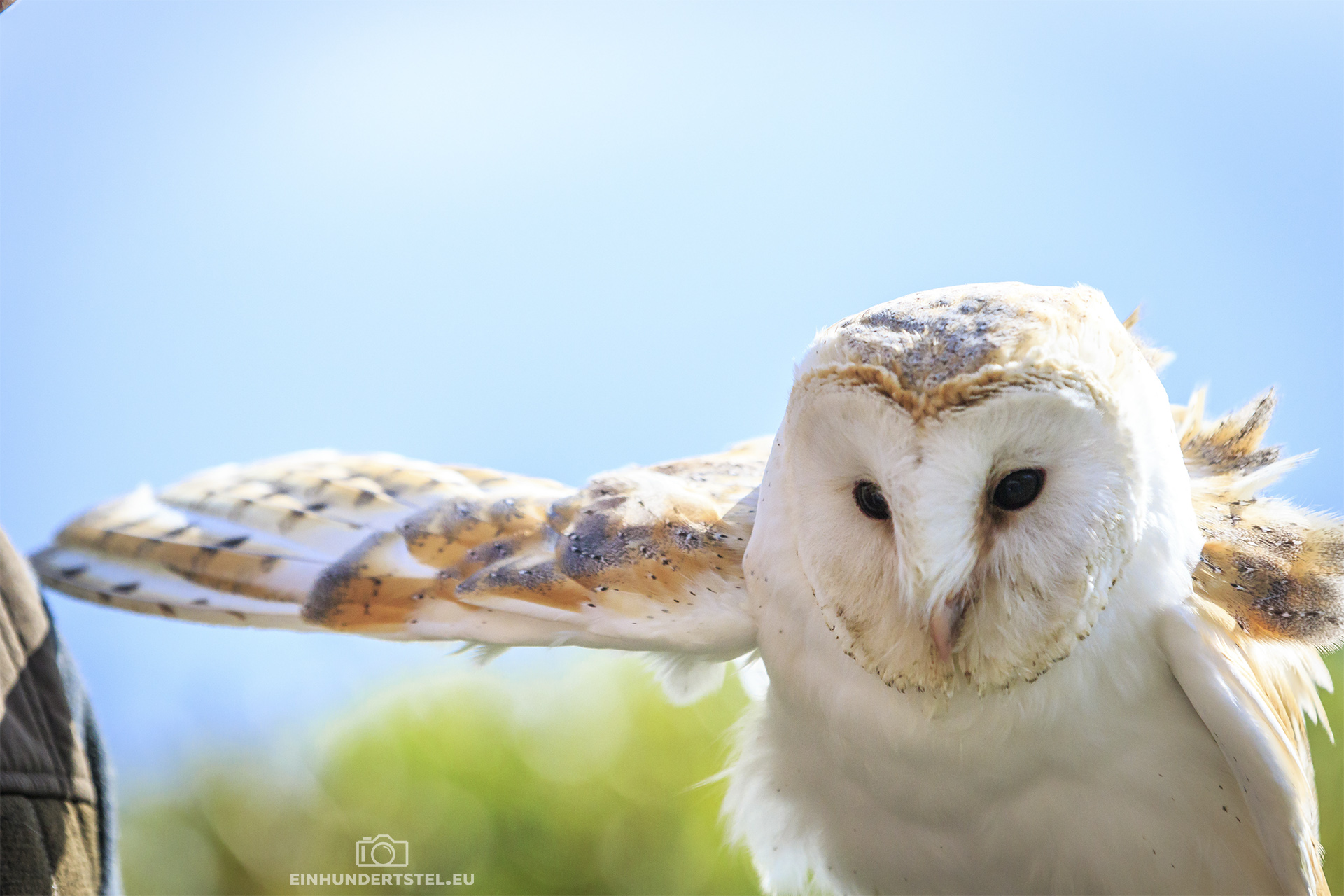 Doch die Greifvögel haben es mir echt angetan. Noch dazu, wo jetzt eine neue Attraktion ihr Zuhause in der Falknerei gefunden hat. So hat Schneegeier Gabi das große Los gezogen und gehört jetzt zu den 46 Vögeln dazu, die in der Falknerei Herrmann den Zuschauern ihre Bedeutung, ihre Lebensweise und ihre besondere Fähigkeit nahe bringen können.