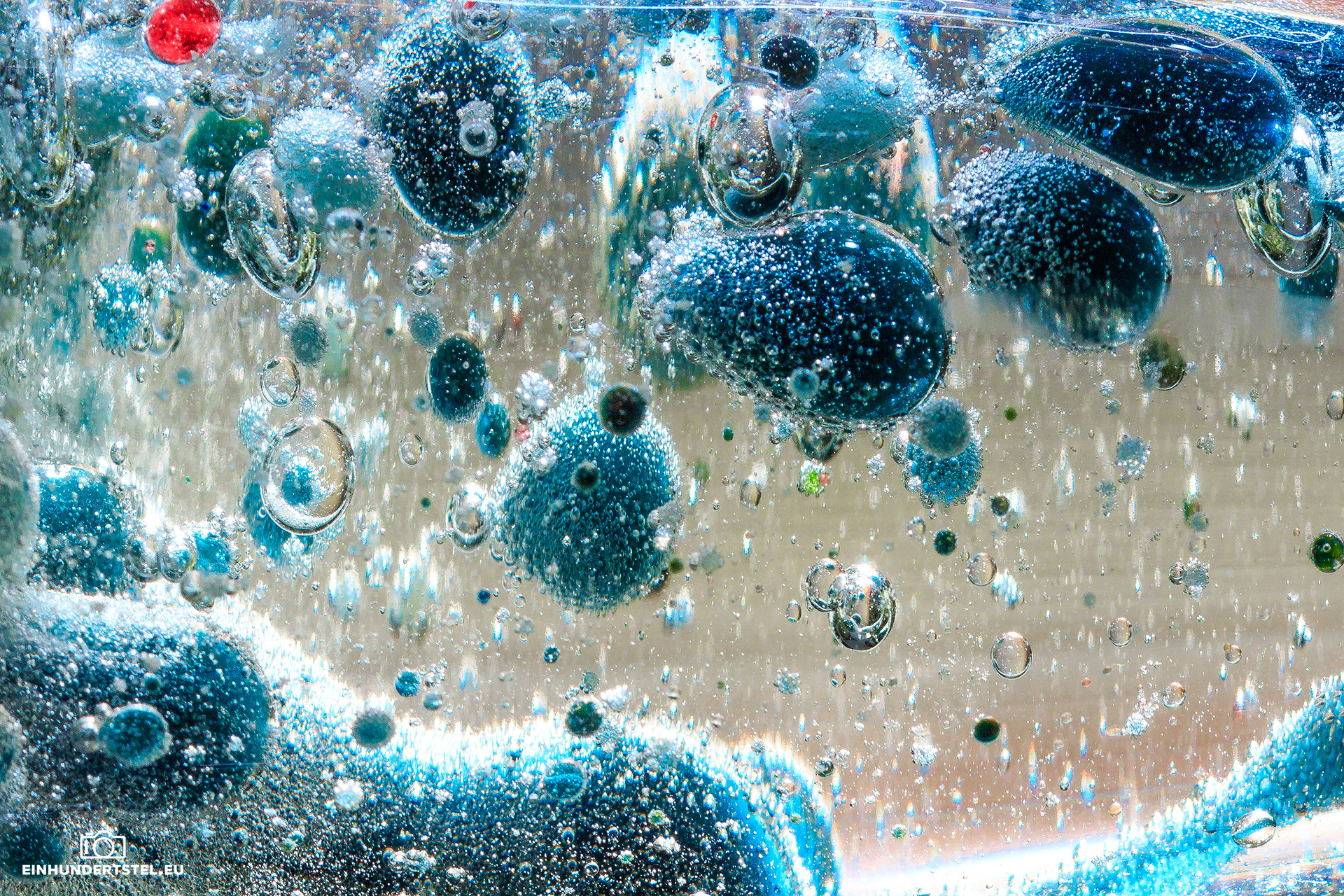 Naja… Der Effekt eher nicht so berauschend. Hat zwar leicht geschäumt aber wir wollten doch eine Lavalampe fotografieren. So sollte die Lebensmittelfarbe sich mit den Wasserblasen vermischen und durch die Brausetablette nach oben steigen. Doch unser Mischungsverhältnis war wohl total falsch berechnet. Wer hat denn eigentlich irgendwas berechnet? Ich nicht. Rico?