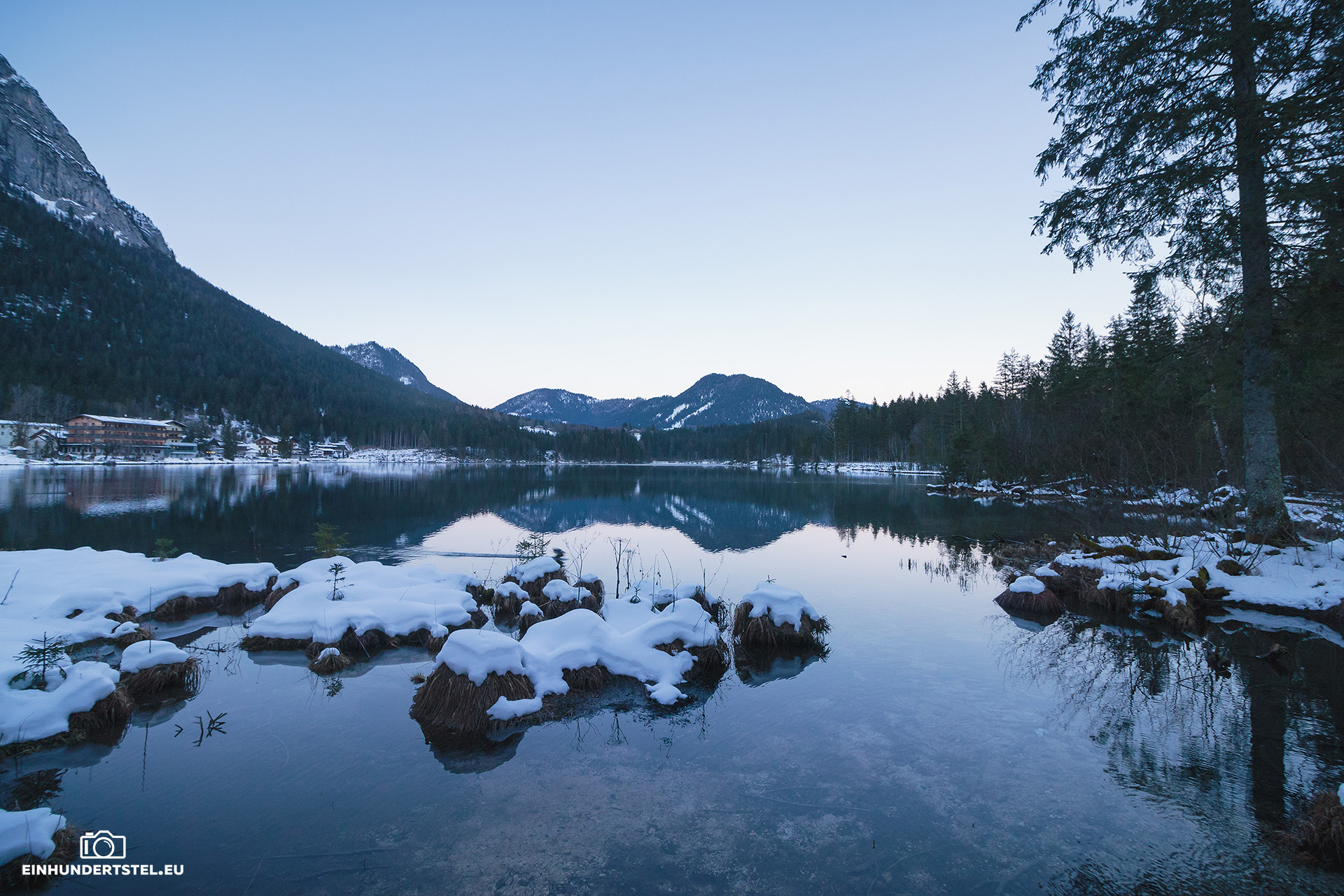 Im Hotelzimmer durften wir ja sowieso erst später einchecken und deshalb sind wir gleich zu unserem Lieblingsspot gefahren. Zum Hintersee in Ramsau. Inzwischen hatten wir auch das Wetter welches wir uns redlich verdient hatten. Nämlich strahlenden Sonnenschein, azurblauen Himmel und die Temperaturen um die Null Grad. Und um den See herum und auf den Bergen Schnee.