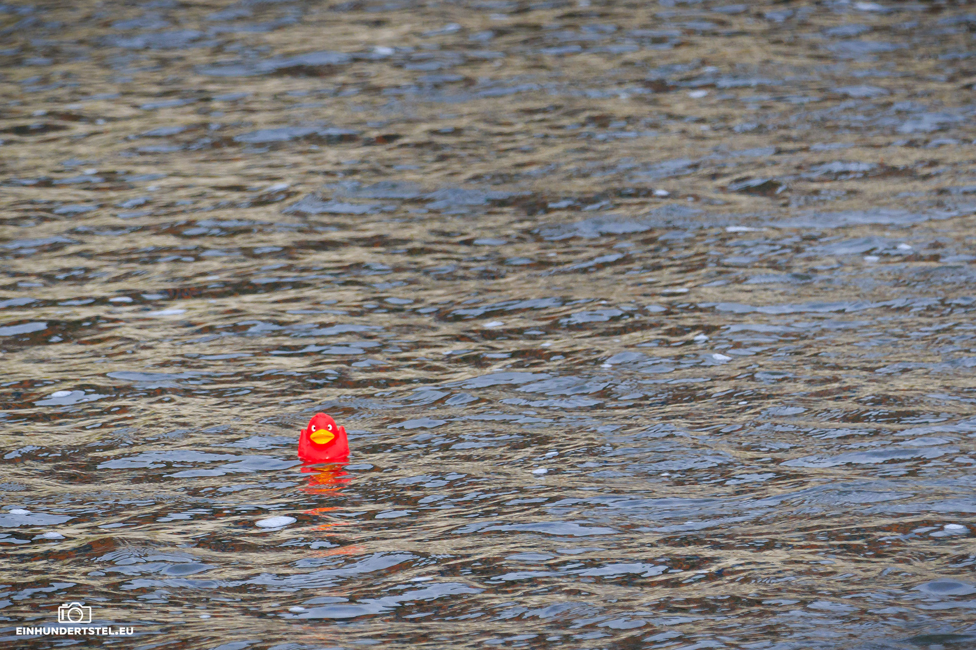 Am Start gab es wohl einiges Gedrängel. Obwohl wir den gar nicht gesehen haben, da wir einfach mal wieder zu spät dran waren. Unser Einsatz begann im Mittelteil. Ziemlich rasant kamen da viele Enten als geballtes Mittelfeld an uns vorbei geschwommen. Die meisten Enten konnten sich aber gar nicht aufrecht halten und schwammen in seitlicher Schieflage an uns vorbei. Doch ein Entchen konnten wir beobachten, welches sich bewusst aufrecht hielt und beherzt auf das Ziel visiert war. Als die Gummientchen ins Rennen gingen, waren die echten Enten gar nicht zugegen. Sie wollten sich wohl einfach nicht ins Geschehen einmischen. War doch wirklich richtig fair von ihnen.