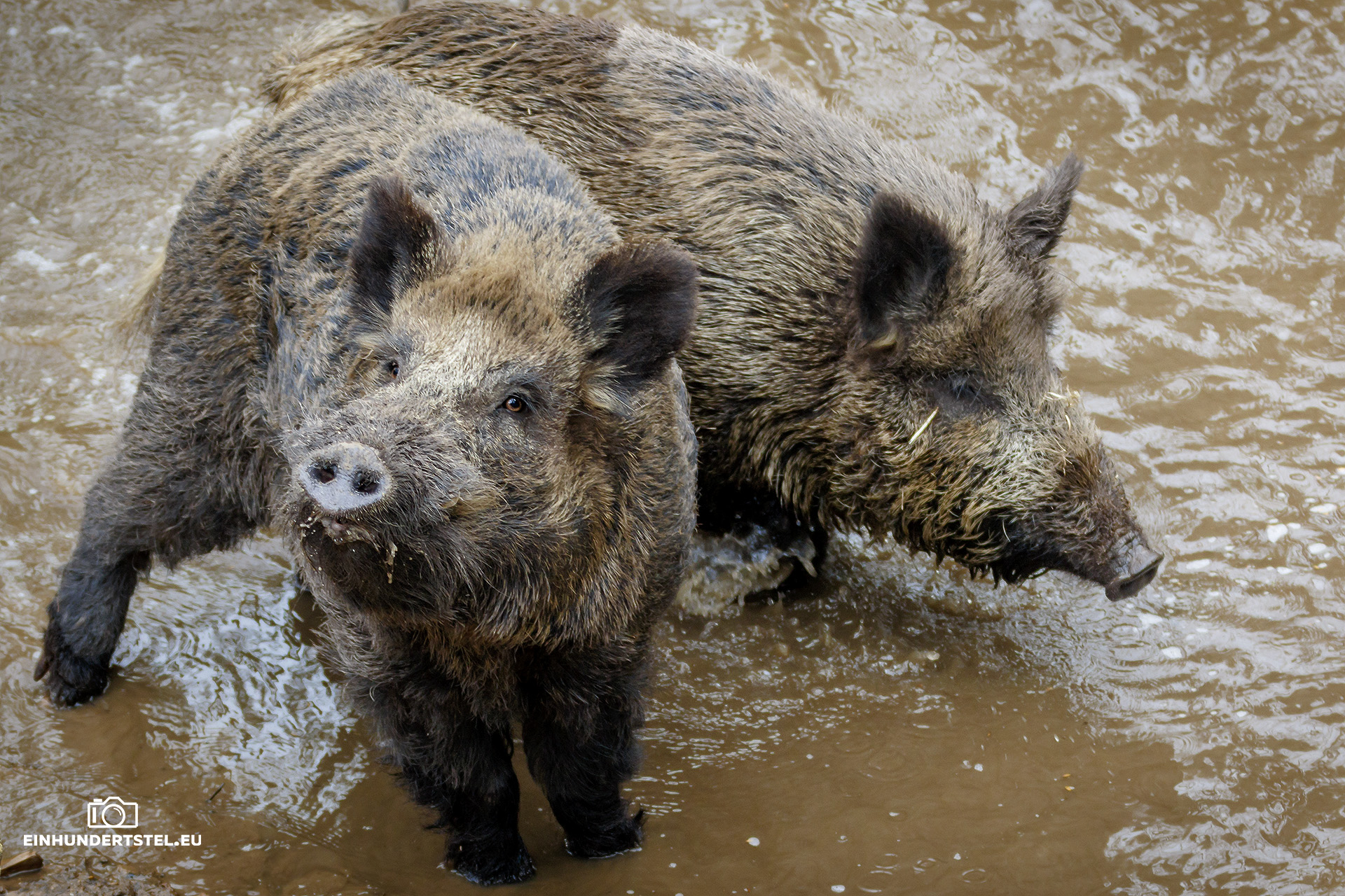 Im Anschluss ging es über den Hochweg zu den Wildschweinen. Auch Frischlinge waren zu beobachten. Was uns aufgefallen ist, dass die Wildschweine ihr Pippi in ihren Swimmingpool entlassen und gleich danach das Wasser wieder trinken. 😉 Heute durften sie nach der Winterpause das erste Mal wieder baden und das machen sie wohl auch ziemlich gerne.