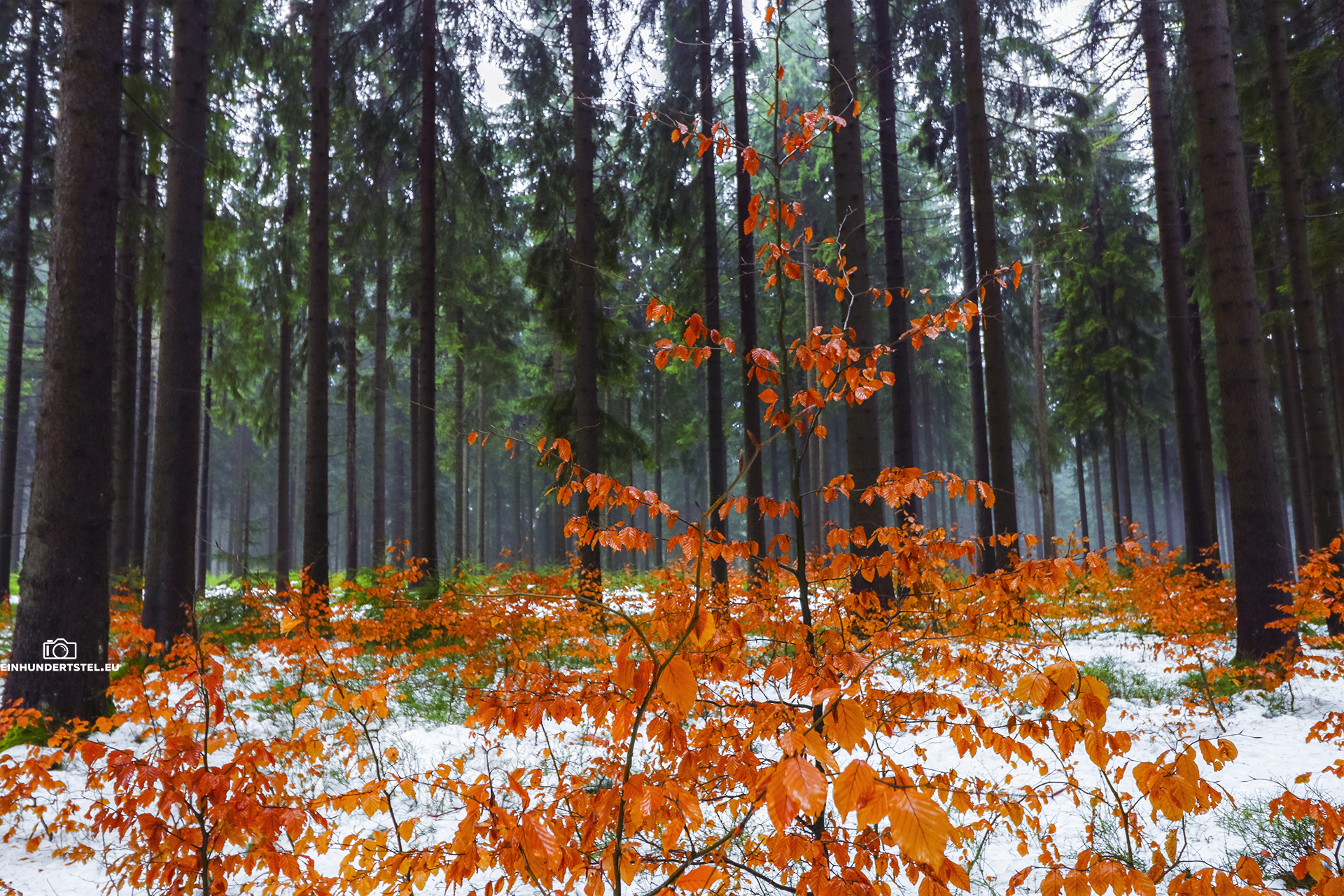 Auf dem Heimweg zwischen Klingenthal und Schöneck kam ein Waldstück wo wir die orangen Blätter der kleinen Laubbäume im Nebel der hohen Bäume leuchten sahen. Das ließ unser Fotografenherz spontan höher schlagen. Das Auto wurde abgestellt und wir gingen auf Fotojagd.
